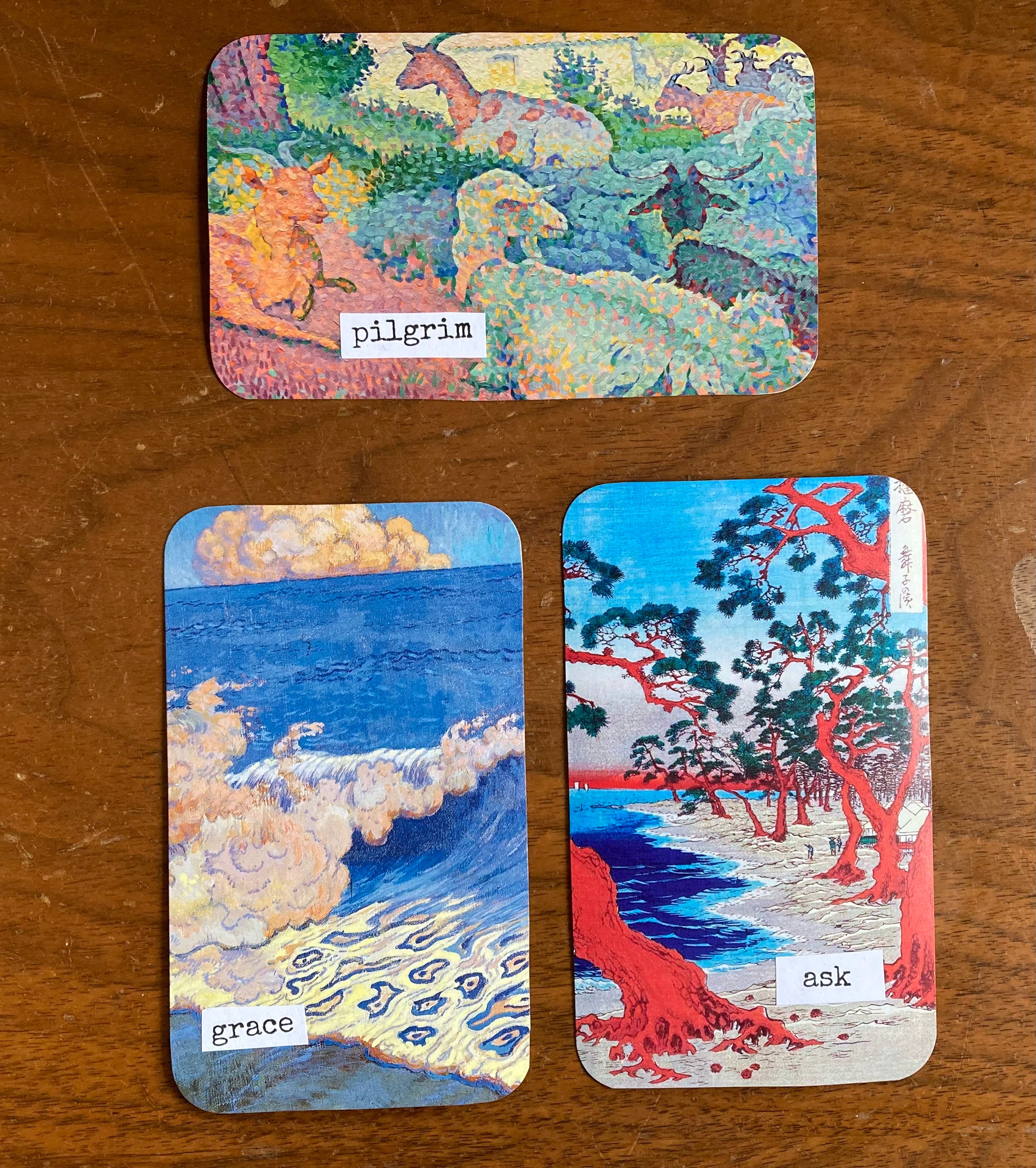 I also plan to post pictures of my Personal Universe Deck throughout the month. I learned about the deck from the work of Tammi Salas. I glued images from our daily art calendar onto index cards and than added words. You can use the image or the words or even the collection of words to spark your new creative work.